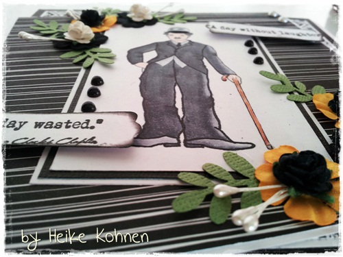 Für Vildastamps habe ich eine Karte mit Charlie Chaplin gearbeitet. Da ich im Moment diese Farbkombination sehr mag, habe ich die gelben Blumen als I-Tüpfelchen mit auf die Karte gebracht.