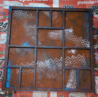 Mit Schablonen wurden hier Muster aufgebracht. Die Farbe, die ichhier benutzt habe ist Gesso weiß mit etwas Wasser verdünnt. Es darf auch ruhig gekleckst werden, das ist so gewollt.